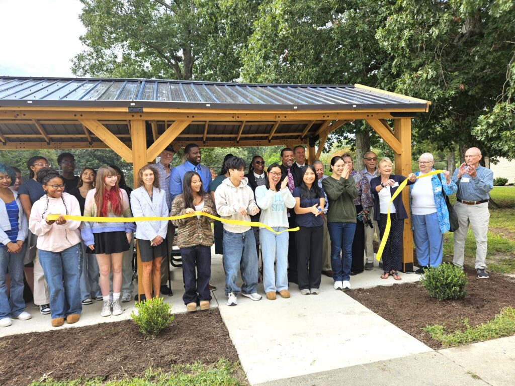 Members of the Kecoughtan High School Key Club cut the ribbon to officially open the pavilion. Dr. Dwayne Lucas, executive principal is in the second row – the tall gentleman in the blue suit. Also shown are the members of the Key Club, members of the Hampton City Schools staff and members of the Kiwanis Club of Mercury 64.